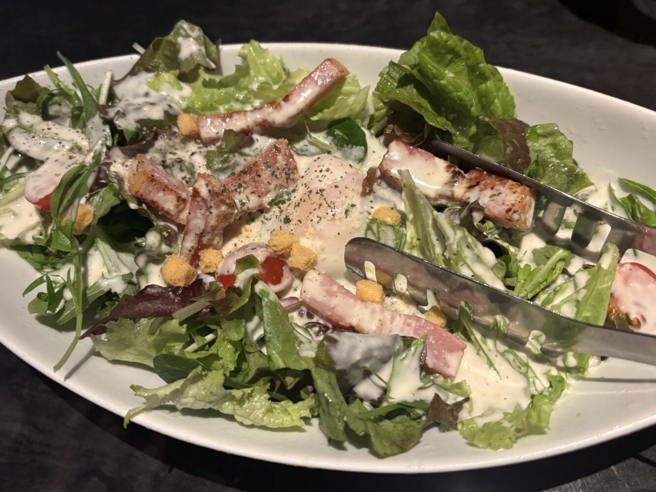 半熟卵、厚切りベーコン、クルトン入りの、すっっっごく理想のシーザーサラダですっっ‼️‼️