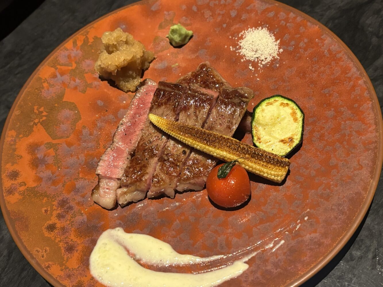 こちらのステーキ、柔らかくてすっっごく美味しいんですけど、大根おろし、わさび、塩で食べ比べしたのが贅沢すぎる〜🤤🤤🤤