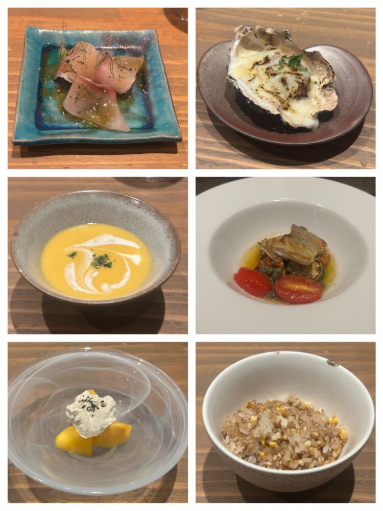 カンパチのカルパッチョ、牡蠣のグラタン、