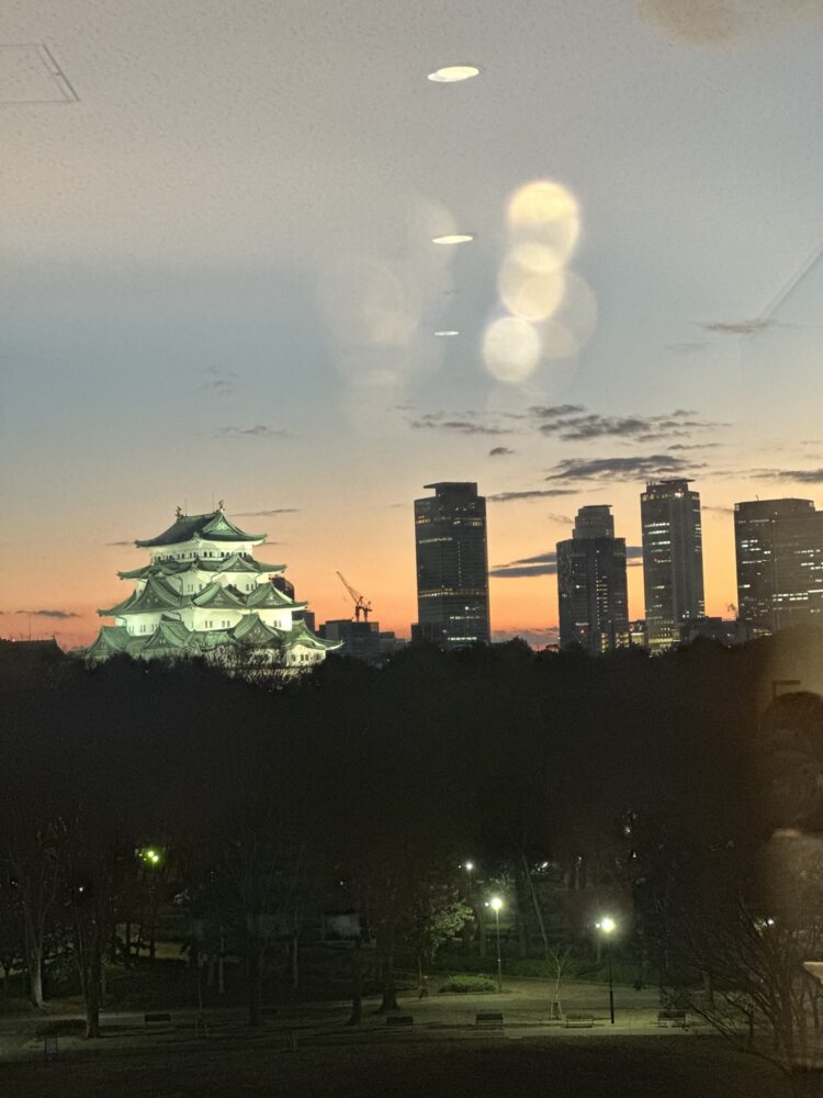 名駅と夕陽、名古屋城のライトアップがこんなに綺麗に見えるとは思わなくて衝撃💥私も並んで撮っちゃいました笑